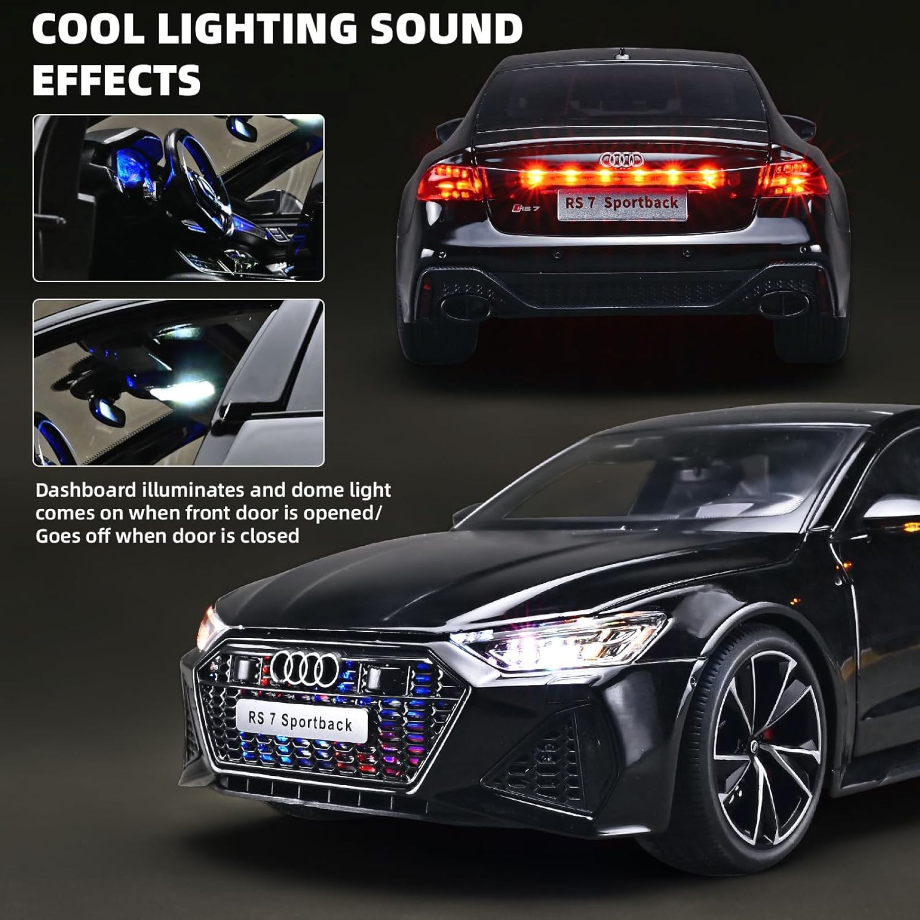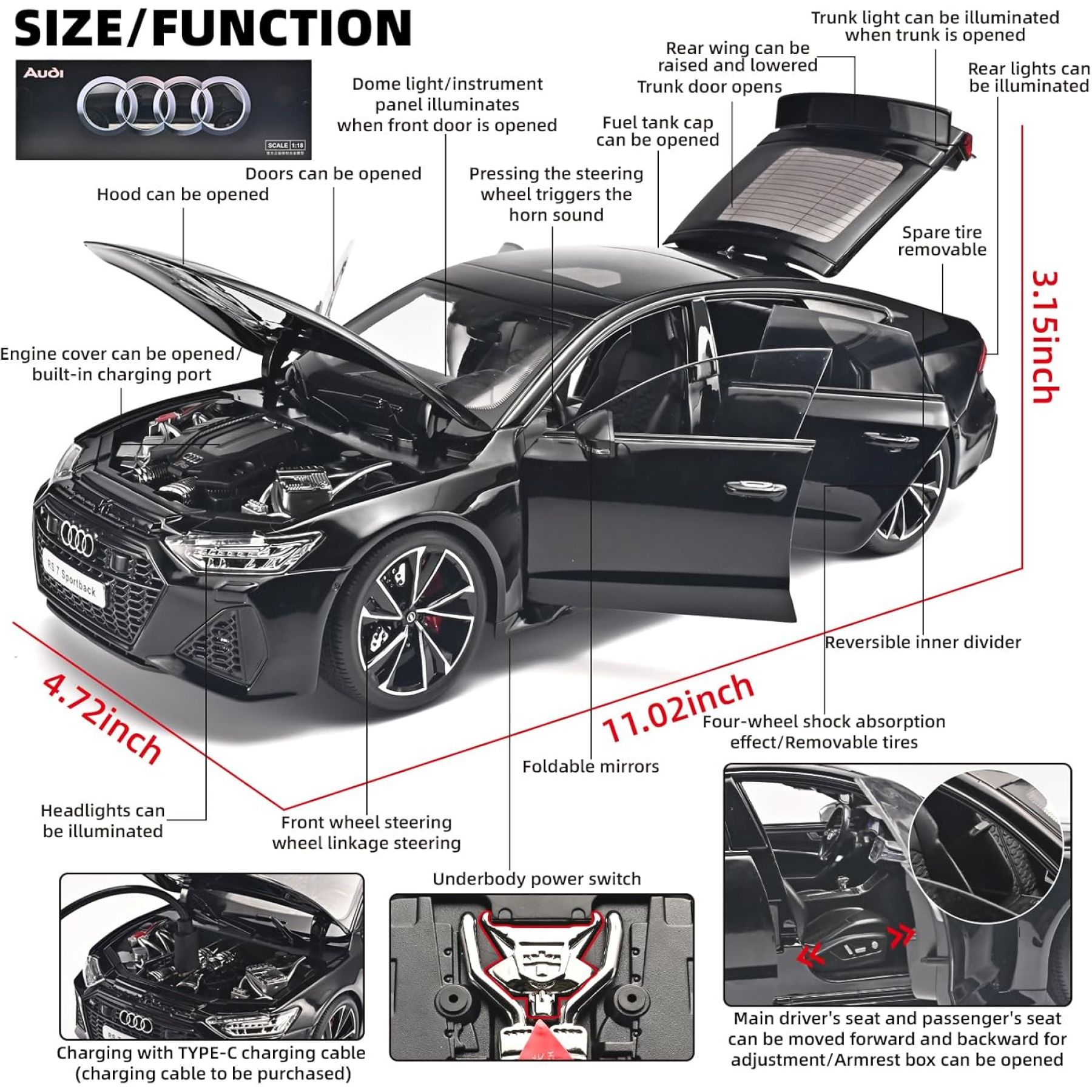 1/18 ölçekli Audi RS 7 Sportback model araba, hem koleksiyoncular hem de otomobil tutkunları için üretilmiş, detay seviyesi yüksek bir metal (alloy/die-cast) makettir. Bu model, gerçek Audi RS 7'nin sportif tasarımını ve agresif hatlarını birebir yansıtacak şekilde ölçeklendirilmiştir.